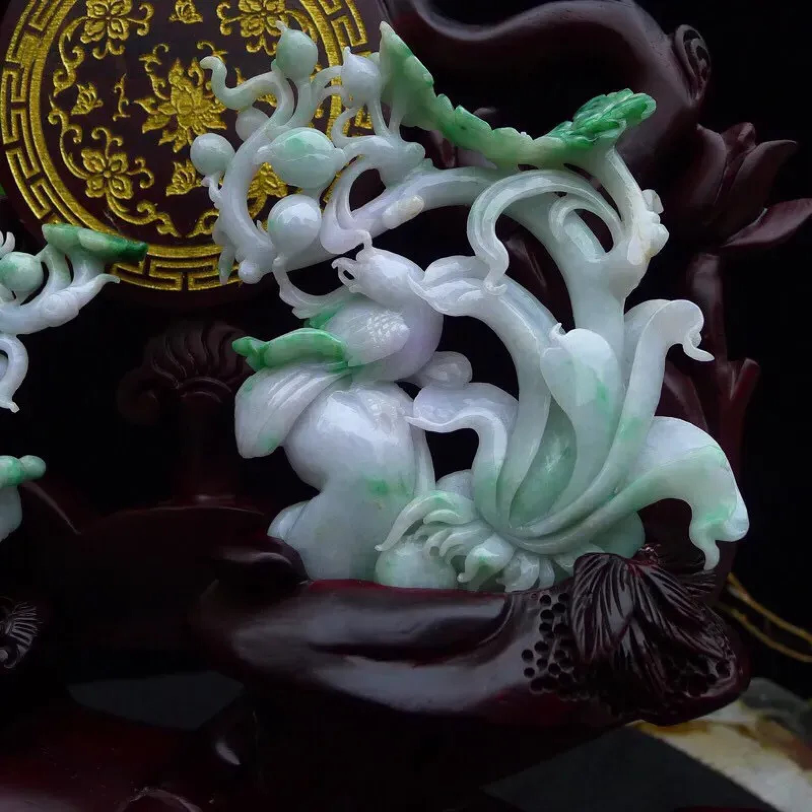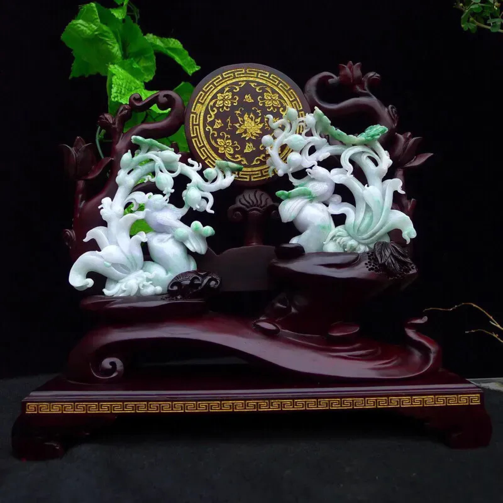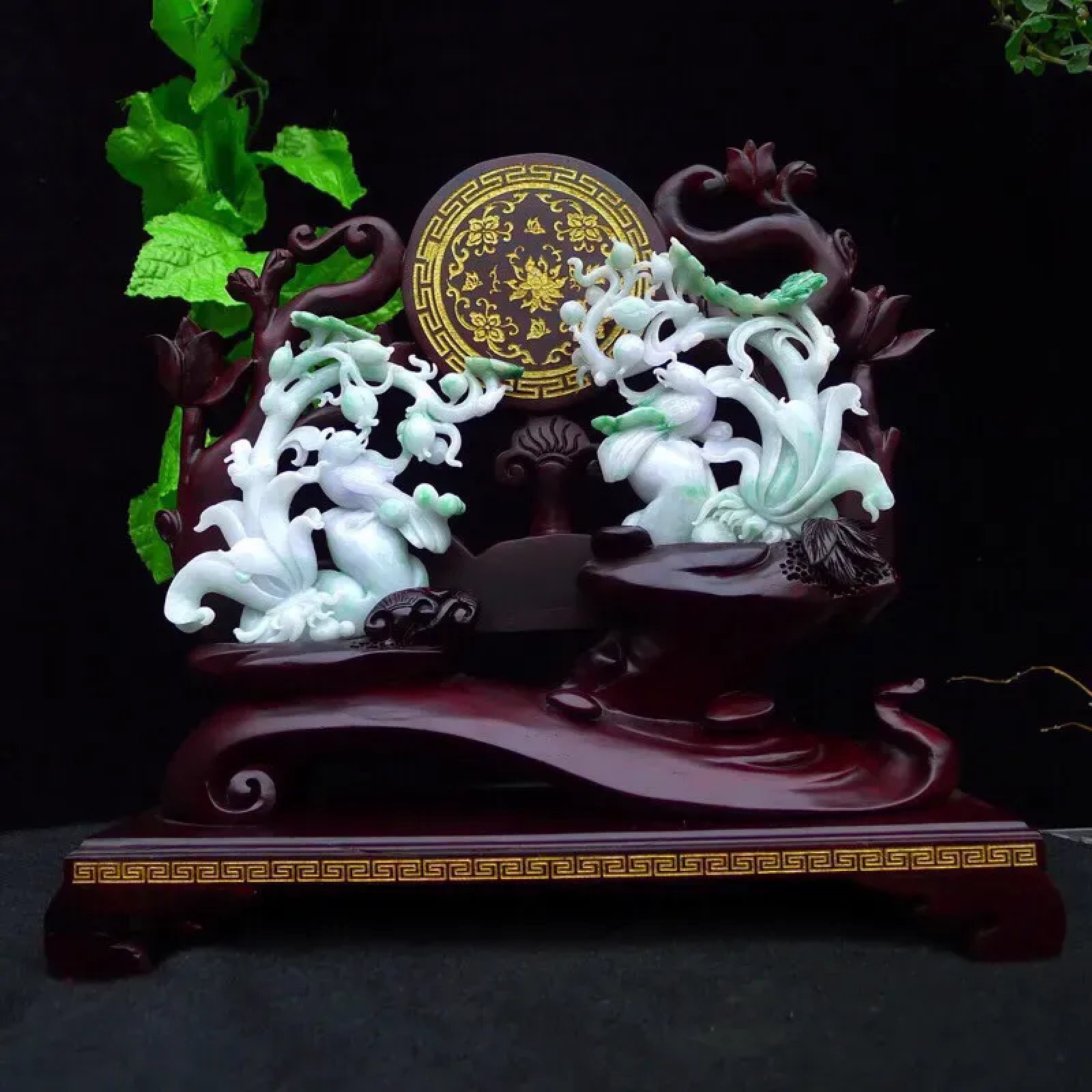 | 特点: | 翡翠简介:1. 老坑水润,质地细腻温润,具备一定的通透感,表面光泽柔和莹润,是质感优良的中高端翡翠种水。2. 主体为淡白底,搭配天然飘绿俏色(部分区域隐带淡紫质感,暗含 “春带彩” 元素):绿色清新灵动地分布于枝叶、鸟羽等细节处,色泽层次丰富且协调自然,既显温润质感,又添雅致灵动感。3. 精工镂空俏雕:雕刻有祥鸟、花卉(如百合)及繁茂枝叶等元素,细节刻画精细逼真; 线条流畅舒展,造型立体鲜活,同时巧妙利用俏色点缀核心装饰部分,工艺细腻且整体造型对称雅致。4. 祥鸟象征吉祥如意,花卉(如百合)寓意和和美美,搭配繁茂枝叶则承载着富贵圆满、生活顺遂的美好祈愿。5. 适合放置在客厅博古架、客厅主装饰柜或书房等区域,既契合其雅致精美的气质,也能营造吉祥和美的空间氛围。具有很高的艺术和收藏价值,是一件难得的精品摆件,值得您的拥有! |