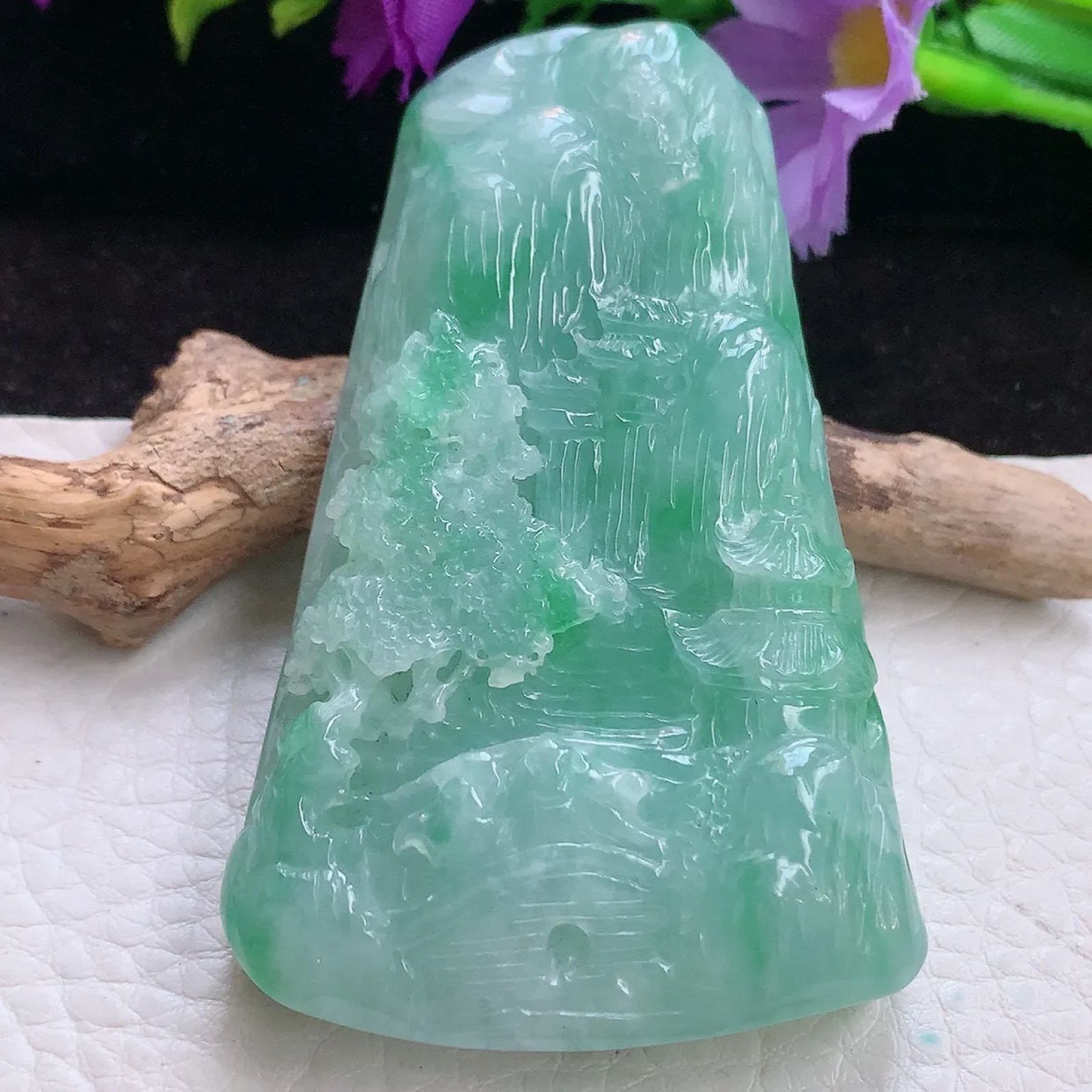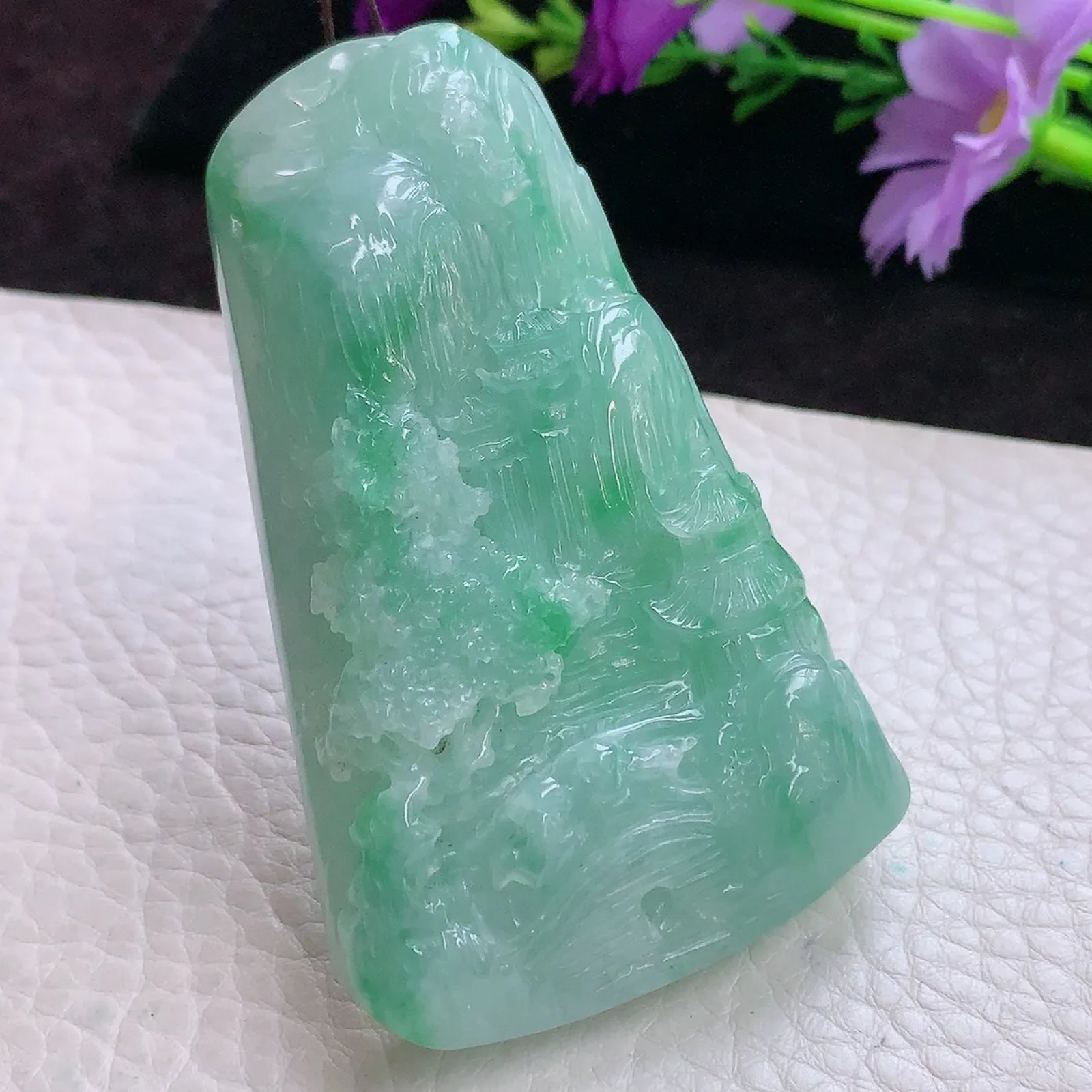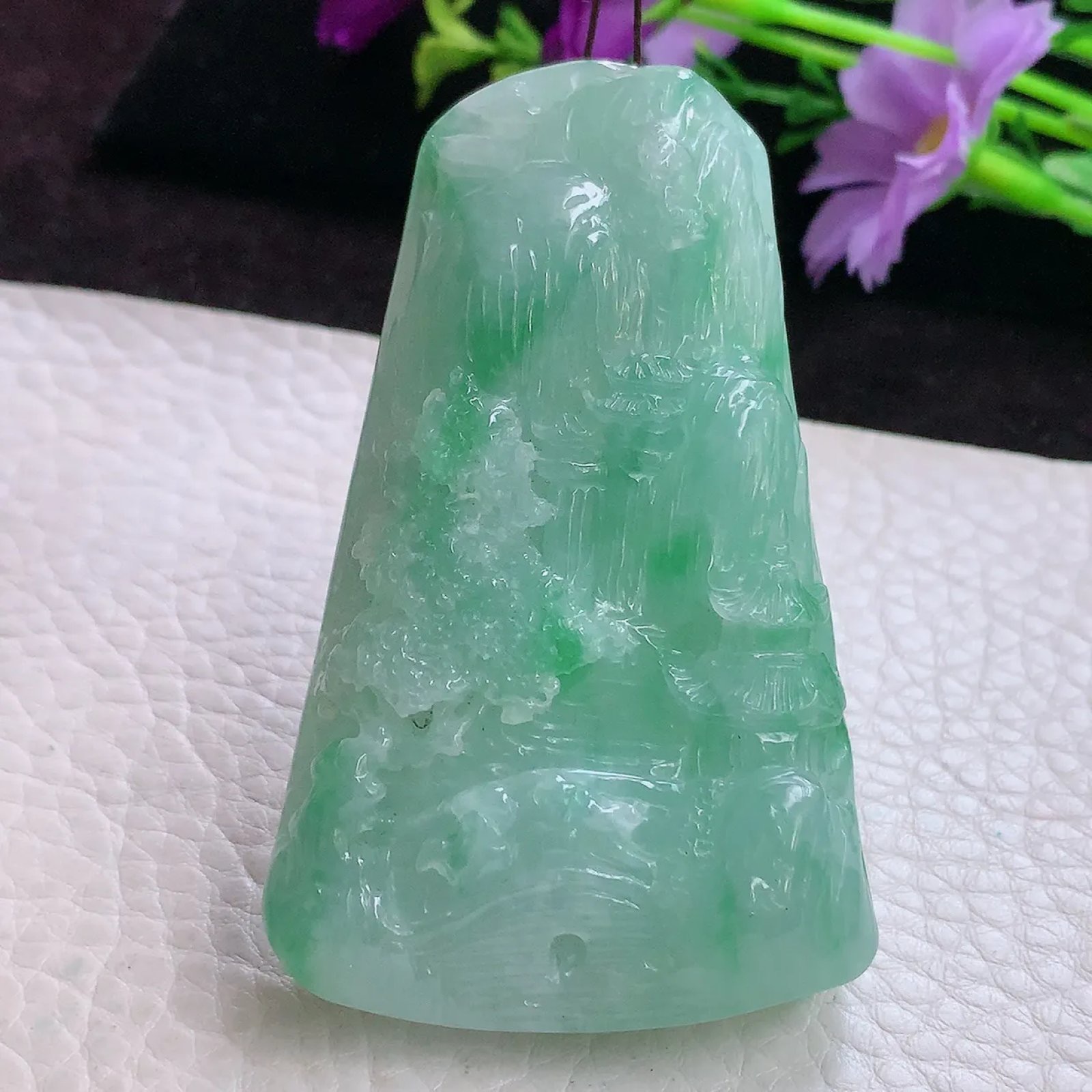 | 特点: | 翡翠简介:1. 老坑老种料,质地细腻通透,光泽莹润感强,是品质较好的中高端翡翠种水,质感清透柔和。2. 呈现均匀清新的淡绿色,搭配自然飘绿:颜色协调灵动,视觉质感温润清爽,是翡翠中讨喜的清新绿色系色泽。3. 采用精工浮雕工艺:题材为山水亭台景致,树木纹理、建筑细节刻画精细逼真;线条流畅自然,层次感丰富,精准还原了山水意境的雅致韵味,工艺细腻且表现力突出。 4. 山水题材寓意 “宁静致远、福寿绵长”,同时承载着 “寄情山水、心境平和” 的美好祈愿。5. 作为翡翠吊坠,尺寸得体,冰莹清透的质感搭配清新绿色泽,佩戴于颈部显得典雅大气,适配日常装饰与各类服饰风格,尽显雅致审美,让人爱不释手。具有很高的艺术和收藏价值,是一件难得的精品吊坠,值得您的拥有! |