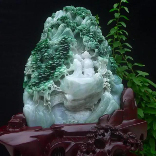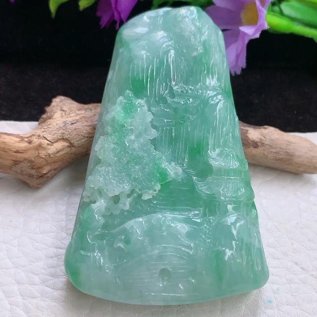 008 天然A货缅甸翡翠飘绿(翠山雅境)人物山水福寿绵长安居乐业精品摆件(赠送定制黑檀实木底座+赠送A货鉴定证书)