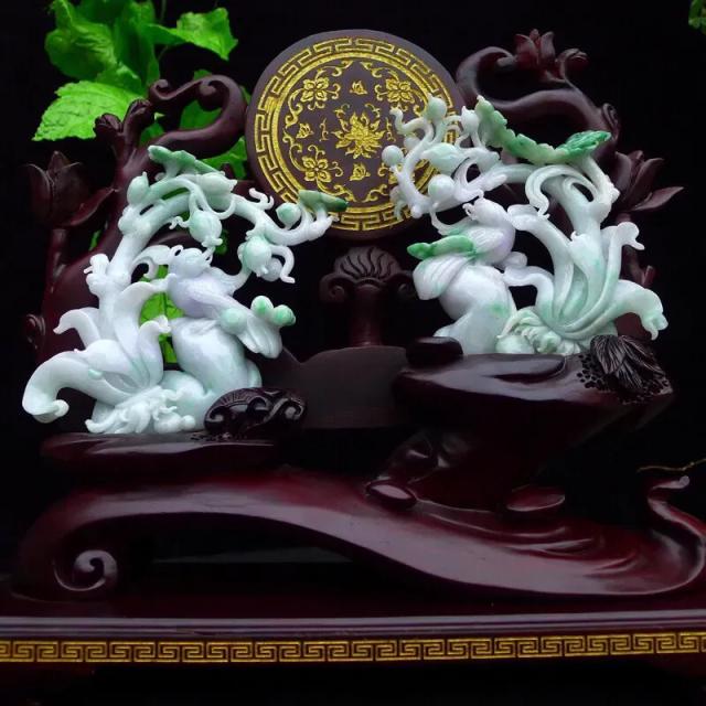 011 天然A货缅甸翡翠飘绿+黄翡(翠枝)多福多子多福吉祥圆满精品摆件(赠送定制黑檀实木底座+赠送A货鉴定证书)