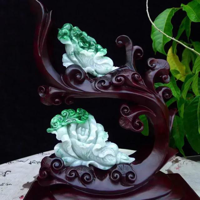 013 天然A货缅甸翡翠飘阳绿(白菜)双财聚福富贵兴旺精品摆件(赠送定制黑檀实木底座+赠送A货鉴定证书)