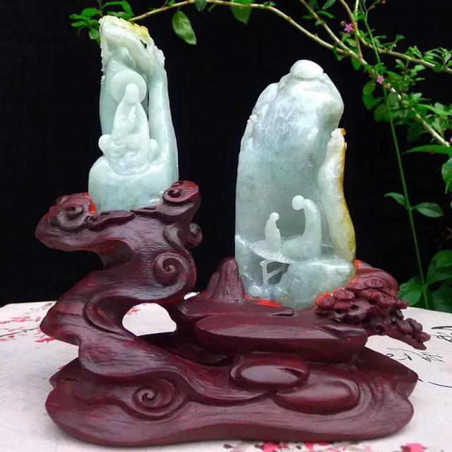 019 天然A货缅甸翡翠浅绿+黄翡(翠山双隐)宁静致远文人雅趣精品摆件(赠送定制黑檀实木底座+赠送A货鉴定证书)