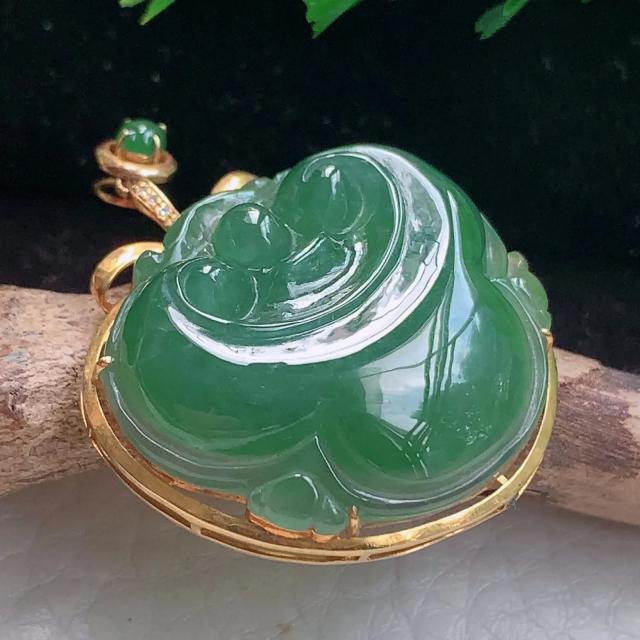 027 天然A货缅甸翡翠18k金扣飘绿(弥勒佛)福气满满招财纳福精品玉佛公吊坠(赠送A货鉴定证书)