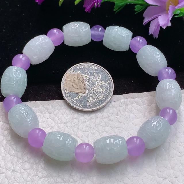 032 天然A货缅甸翡翠淡青白(路路通手链)一路畅通精品玉珠手串(紫色配珠为玛瑙)(赠送A货鉴定证书)