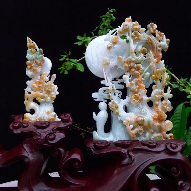 038 天然A货缅甸翡翠浅绿+黄翡(梅月祥和)花好月圆福气圆满精品摆件(赠送定制黑檀实木底座+赠送A货鉴定证书)